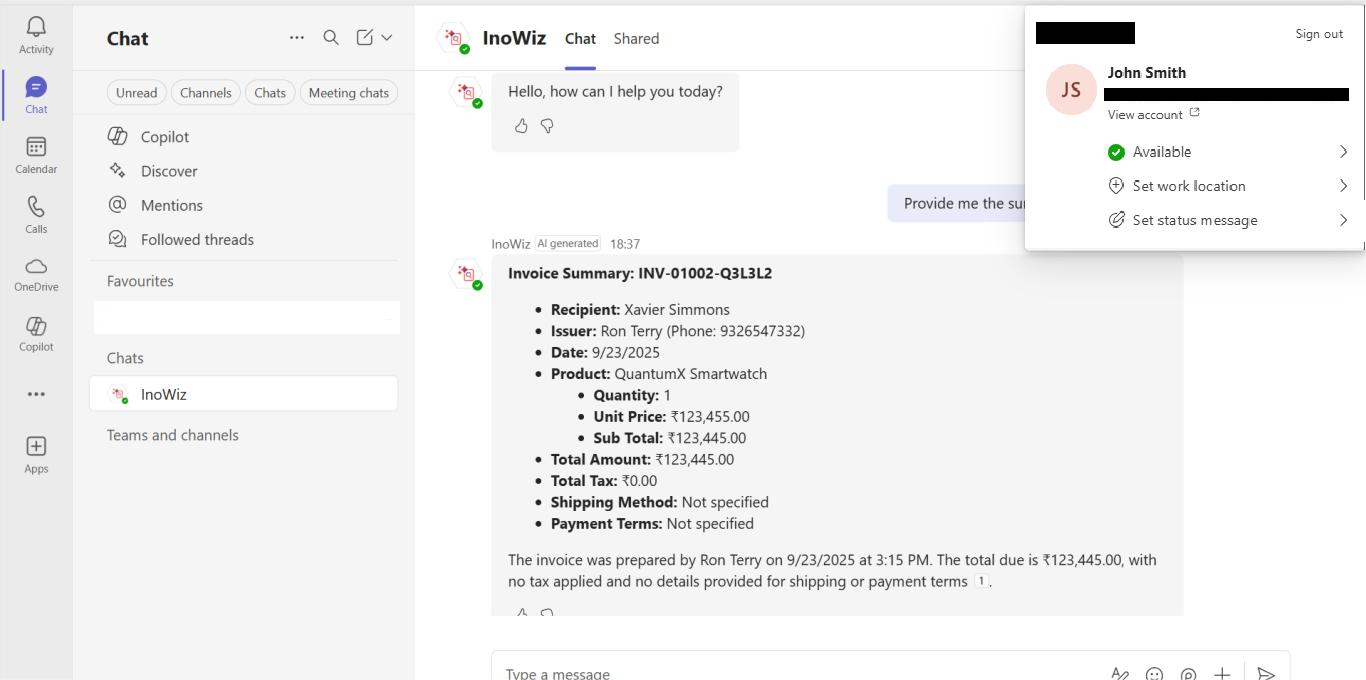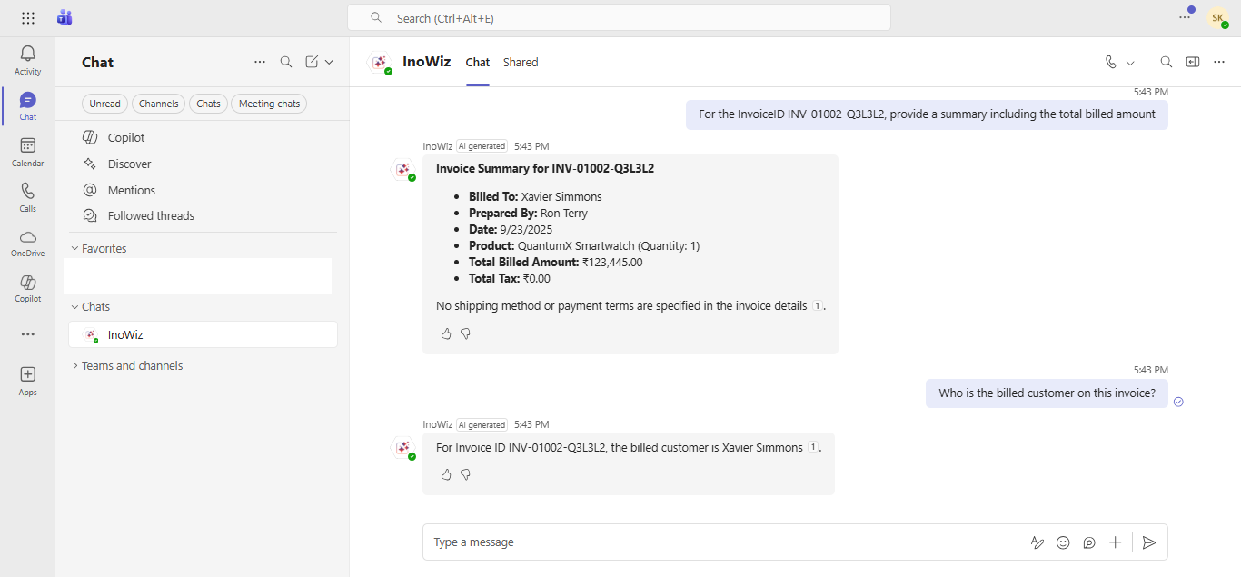 Users can now ask conversational questions directly to InoWiz Copilot, such as “For the invoice ID INV-01002-Q3L3L2, provide a summary including the total billed amount” and instantly get precise, context-aware answers.