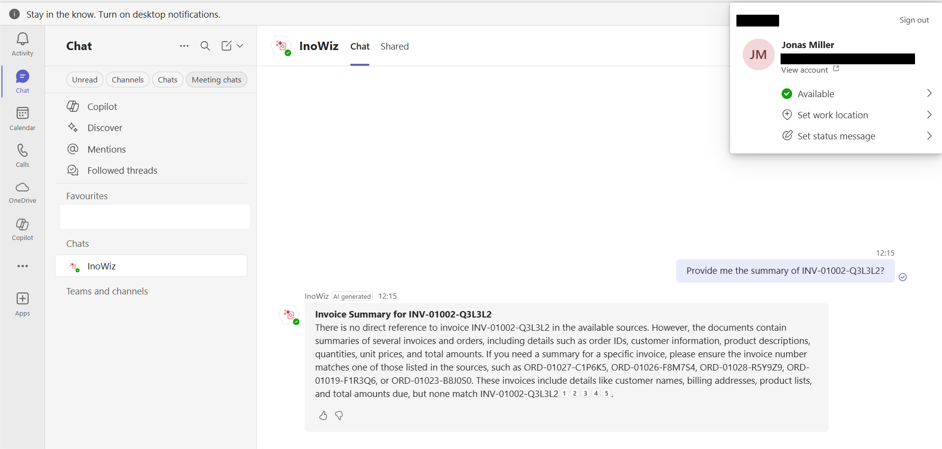 When John (with access rights) asks, “Summarize invoice INV-01002-Q3L3L2,” Copilot provides the summary.
