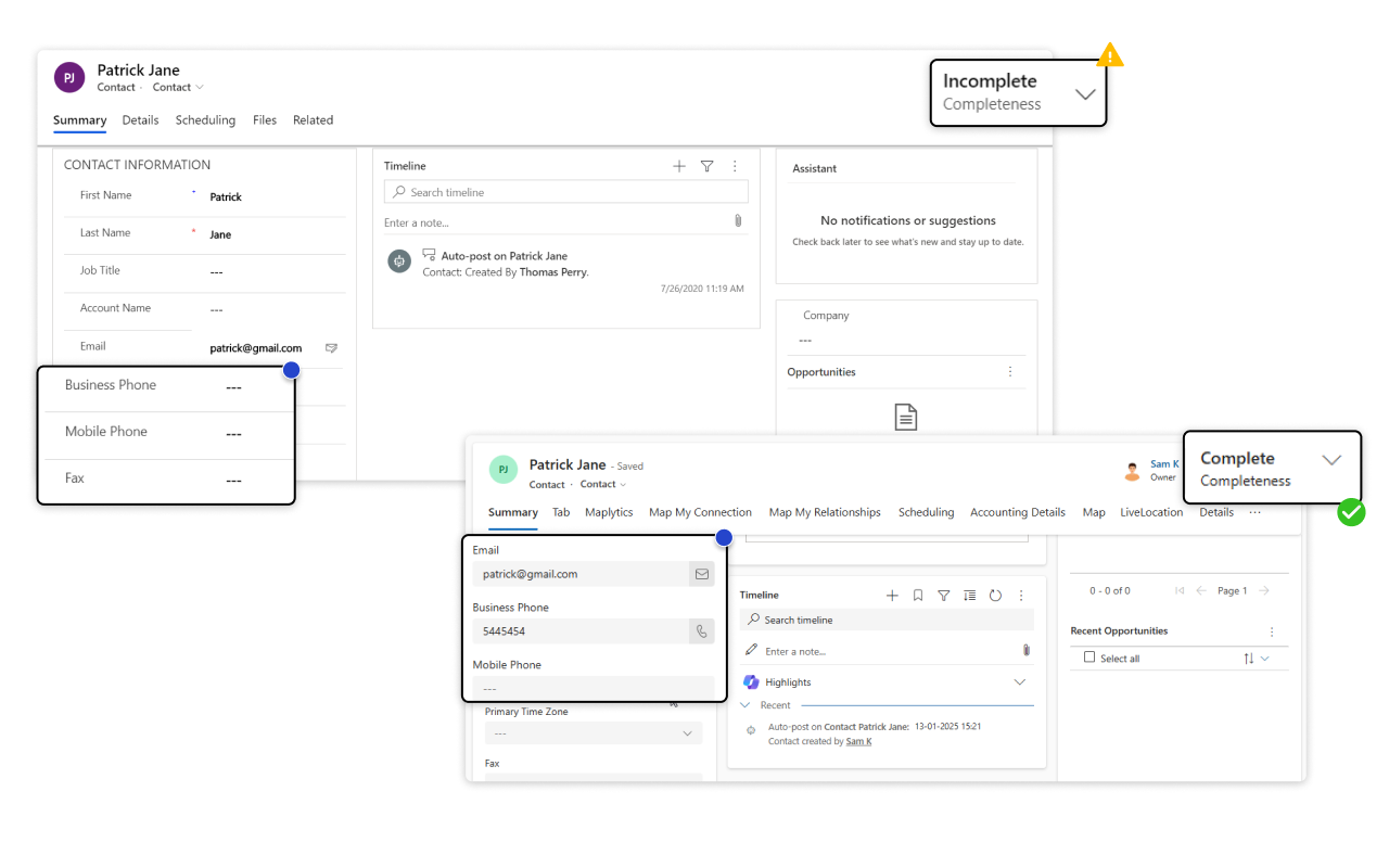 A major challenge in CRM systems is incomplete data, like leads with missing phone numbers or opportunities missing revenue numbers. User Adoption Monitor includes a feature that marks records as “complete” only when required fields are filled in. This nudges teams to enter full information and improves overall data quality.