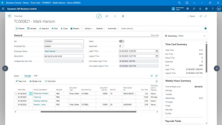 Shop Floor Insight streamlines the time card approval process by flagging issues like missing setup time or excessive runtime directly within the approval worksheet. By surfacing validation messages at both the card and line levels, supervisors can quickly resolve discrepancies without digging through individual records, improving accuracy and speeding up payroll approvals.