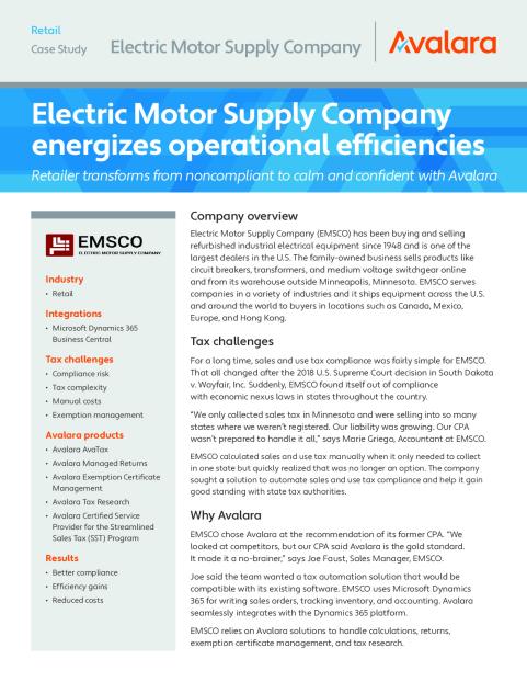 As EMSCO expanded beyond collecting tax in a single state, manual sales and use tax calculations were no longer sustainable. By automating tax compliance with Avalara integrated into Microsoft Dynamics 365, the company improved efficiency, reduced risk, and gained confidence in tax accuracy. The integration saves significant time on sales orders, and EMSCO estimates that without Avalara it would need an additional team just to manage tax returns.