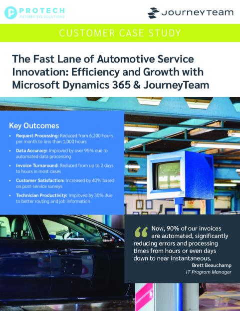 Protech Automotive Solutions, a nationwide provider of diagnostic and calibration services, was limited by disconnected systems and manual scheduling that obscured technician availability, job status, and billing progress. JourneyTeam built a connected field operations platform using Microsoft Dynamics 365 and Power Platform, unifying scheduling, mobile work execution, and automated workflows from service request through invoicing. With centralized data and streamlined processes, Protech has cut administrative hours, accelerated invoicing, and boosted customer satisfaction and technician productivity, creating a scalable foundation for future growth.