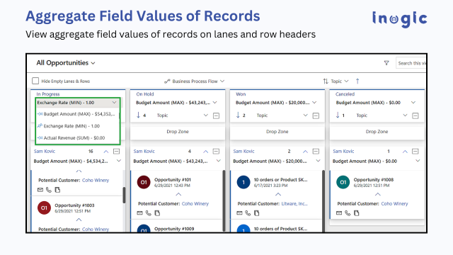 Easily move Kanban cards between lanes and rows to update record statuses, ownership, or categories in real time—no form opening required.