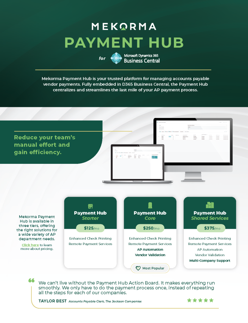 Mekorma Payment Hub is your trusted platform for managing accounts payable vendor payments. Fully embedded in D365 Business Central, the Payment Hub centralizes and streamlines the last mile of your AP payment process.