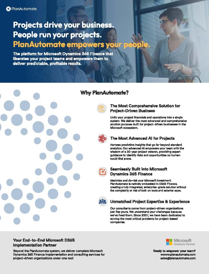 Download this 2-page brochure that provides a high-level overview of PlanAutomate, our solutions, and services for project-driven businesses.
