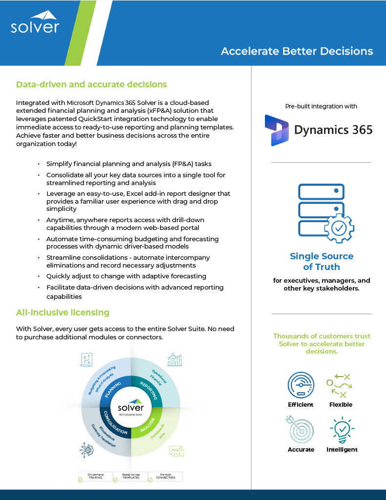 For organizations looking to accelerate growth and gain complete insight into their business, Solver is a cloud-based extended financial planning and analysis solution (xFP&A) that consolidates information from Microsoft Dynamics 365 Business Central and other data sources to provide a single source of truth.
