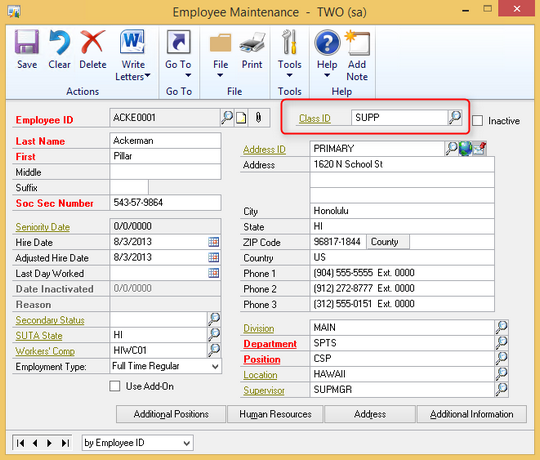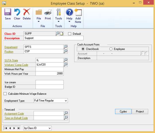 The Employee Class can be assigned to an Employee Maintenance card directly on the main page (see-highlighted area below).